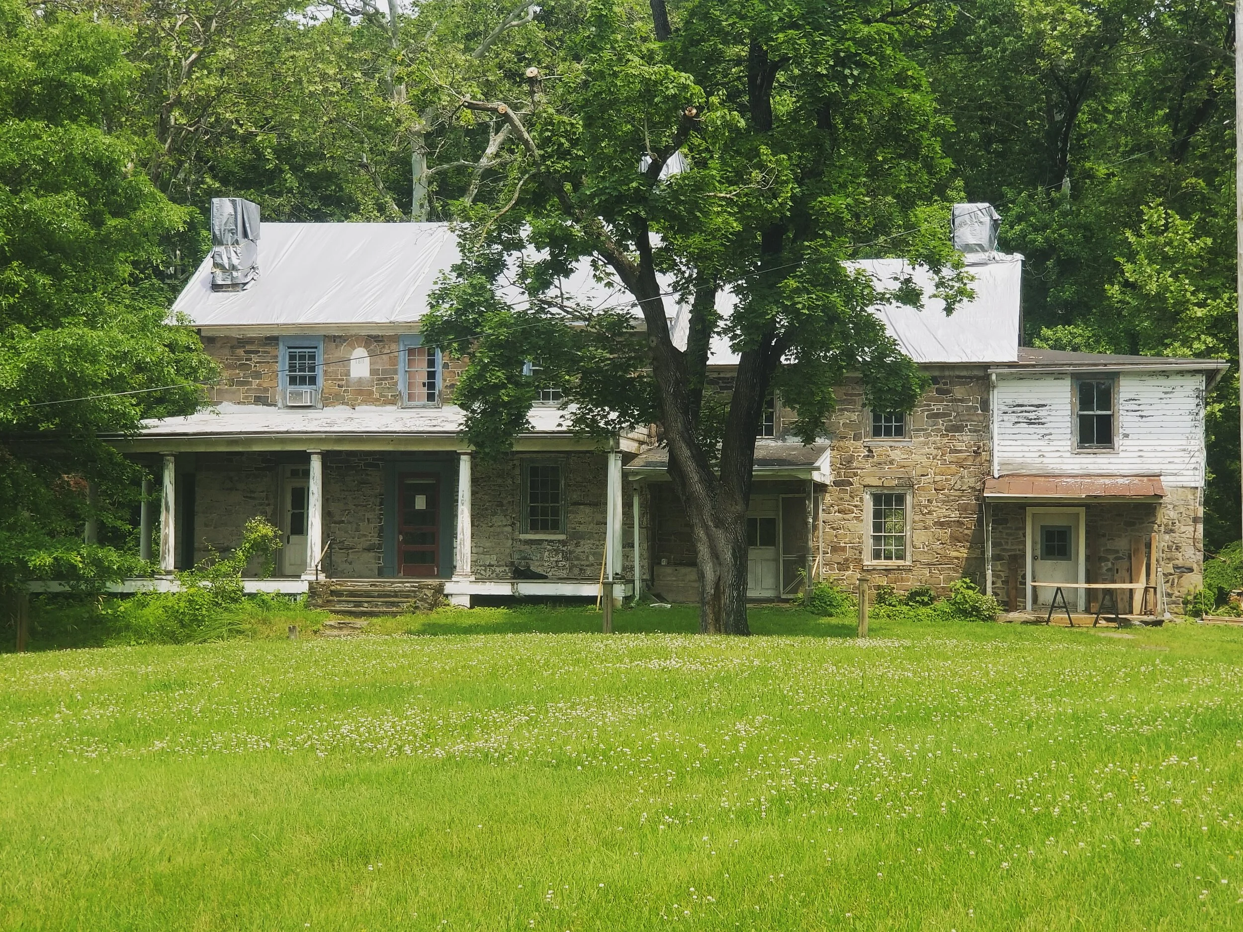 We spent 5 months working with the Advisory Board to outline our scope, discuss options, and ultimately get approval from the Township just to start work. Many debates over what was and was not historic on this house were the root of the issue. Some on the Board took the approach that if it was existing it was historic and therefore should stay. While that is certainly one approach, it is not generally how historic preservation is practiced in the industry. You want to identify the periods of historic significance and bring the property back to those periods, as authentically as possible. This house has multiple periods just to complicate things. It’s original construction of 1744 is pre-colonial. There are early 1800’s renovations and late 18oo’s additions which are Victorian era. Then there are early 1900’s renovations that included things like an Italian Tuscon front porch and the addition of second floors to the late 1800’s add-ons. Plus, a chimney that was moved in the 1950’s and the early 1970’s Formica kitchen which was one of the first things to go. What is and what is not historic was the debate. After months of stalemate, the Board decided they needed to retain a preservation consultant because we could not, and would not, agree with many of the things the Board was rejecting in our application. For example, we wanted to remove one of the 5 front doors that had clearly been added in the late 1800’s when a portion of the porch was enclosed, and return it to a window to make the 1811 wing symmetrical again, as it would have been when built with a center door and window on either side. After a couple more months with the historic consultant on board, we essentially came to agreement on our proposed restoration and renovation work and more or less got everything approved we had asked for 5 months earlier, with the exception of the roofing material. Had the Township had a qualified preservation consultant involved from the start, we could have saved months of time. So end of April/early May of 2019 we officially began work.